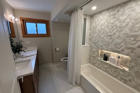 Extending the vanity, switching the shower layout, replacing tile and paint and even switching the door hinges made the most of the space and natural light.